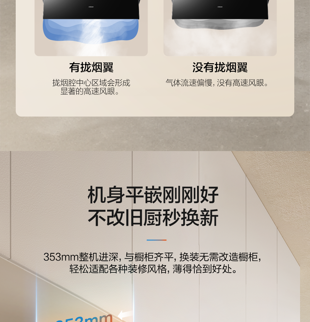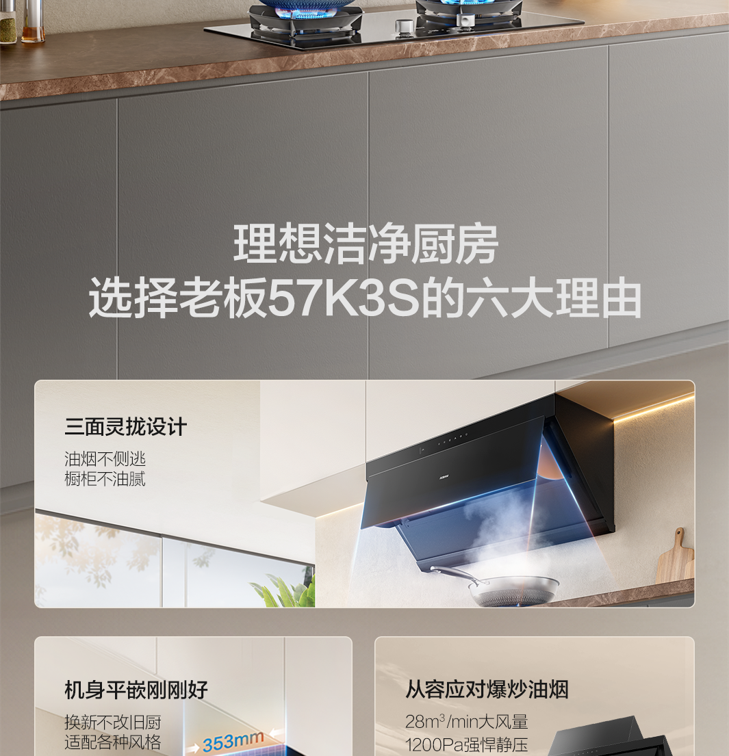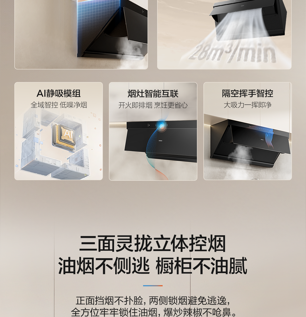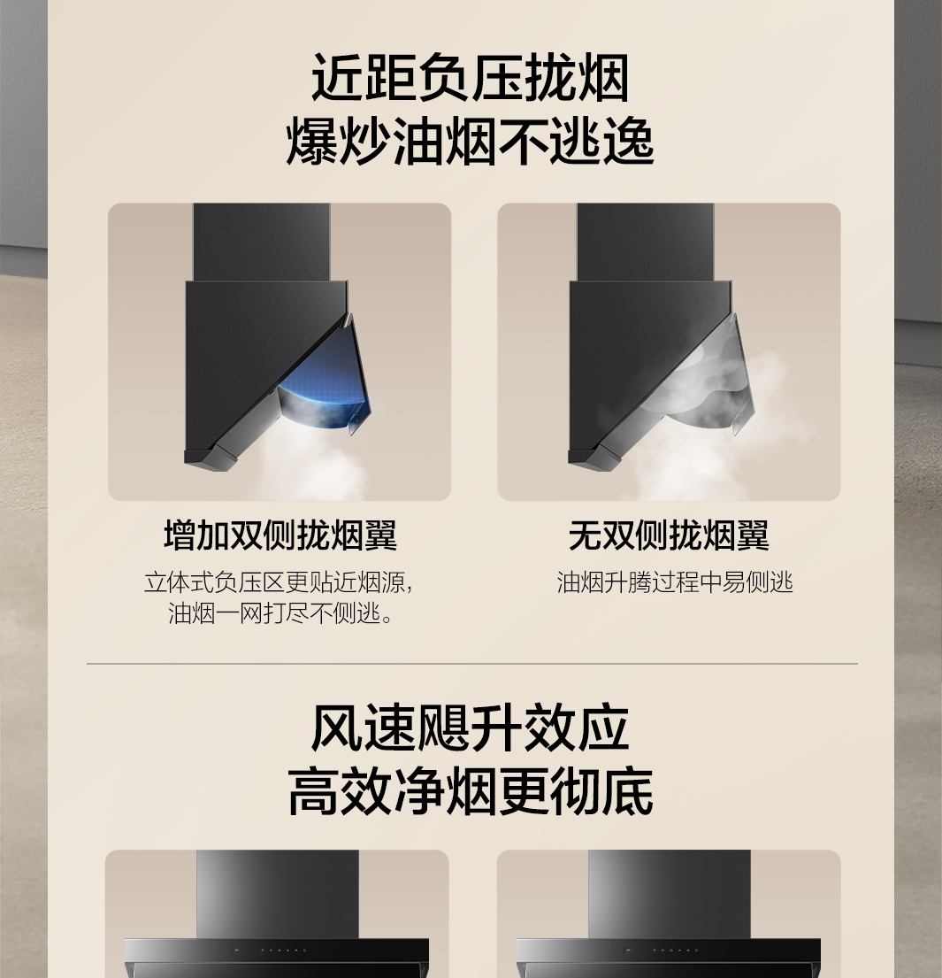 三面灵拢立体控烟,油烟不侧逃,橱柜不油